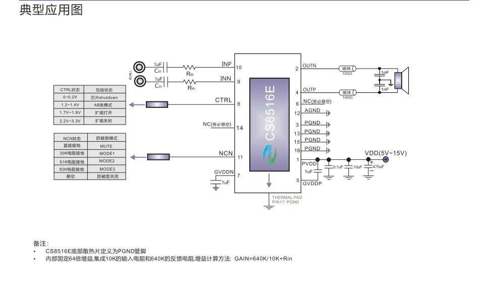 CS8516E的全差分架构和极高的PSRR有效地提高对RF噪声的抑制能力。无需滤波器的PWM调制结构及内置的BOOST升压模块,以及CS8516E采用专有的AERC((Adaptive Edge Rate Control)技术,在音频全带宽范围内极大地降低了EMI的干扰, 对60cm的音频线,在FCC的标准下具有超过20dB的裕量,另外CS8516E内置了过流保护,短路保护和过热 保护,有效的保护芯片在异常的工作条件下不被损坏