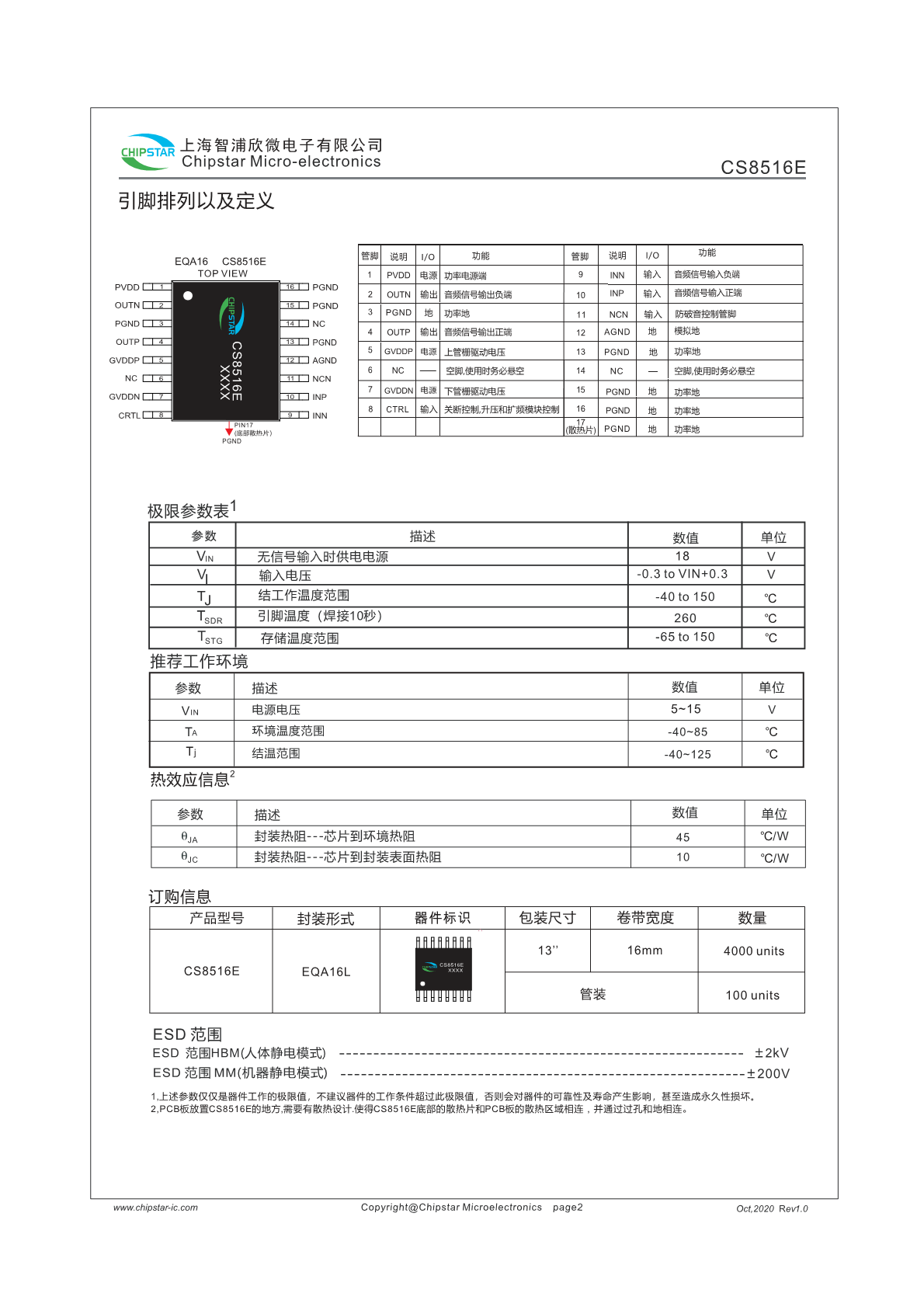 CS8516E提供了纤小的的EQA16封装形式供客户选择 ,封装尺寸和ESOP8一致, 其额定的工作温度范围为-40℃至85℃。