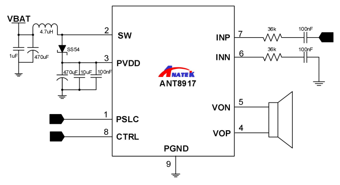 ANT8917 是一款内置高效自适应升压的高信噪比,低底噪,具有 ALC(防破音)功能的AB/D 类双模立体声音频功放。在锂电池 3.7V