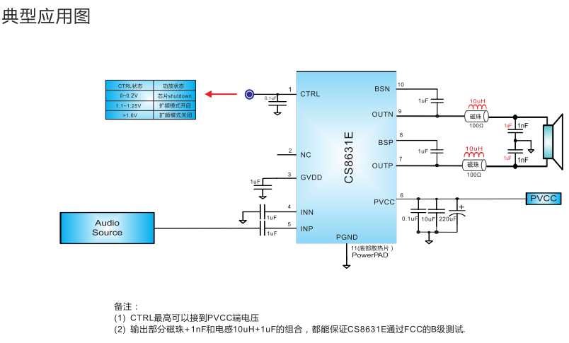 CS8631E供电电压在9V以内,可以驱动2欧负载的扬声器,最高可提供18W的连续功率,在供电电压16V以内,可以驱动低到4欧负载的扬声器,提供32W的连续功率。CS8631E具有高达92%的效率,使得在播放音乐的时候不需要额外的散热器。