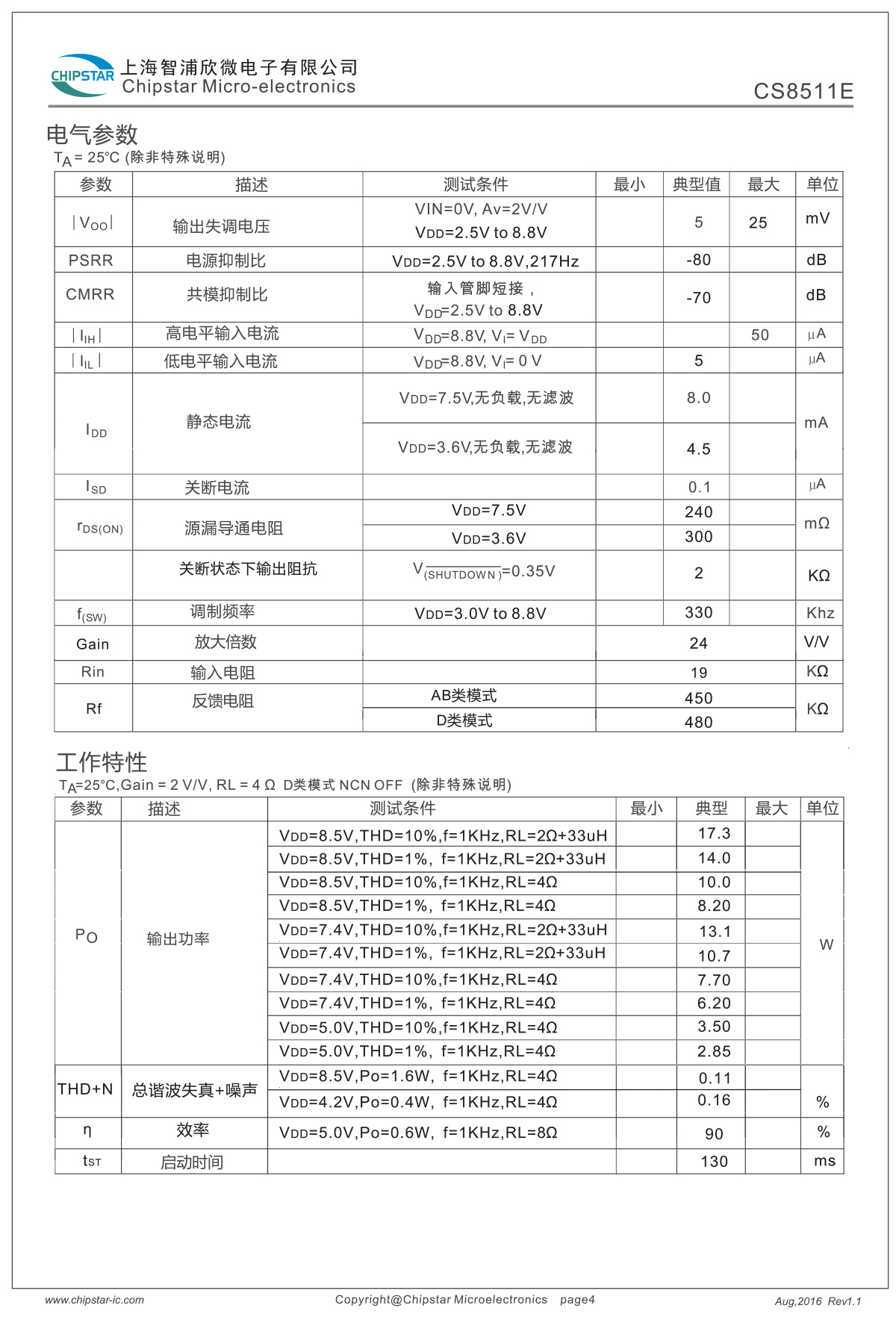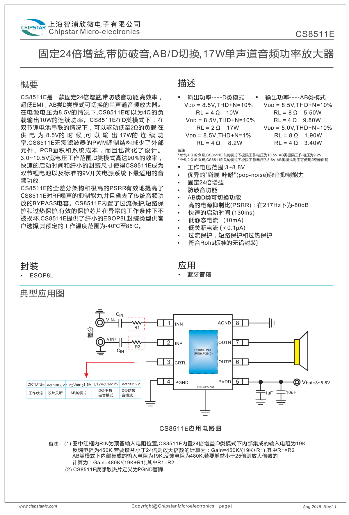 Po=8.2W@1%THD VDD=8.5V,RL=4Ω