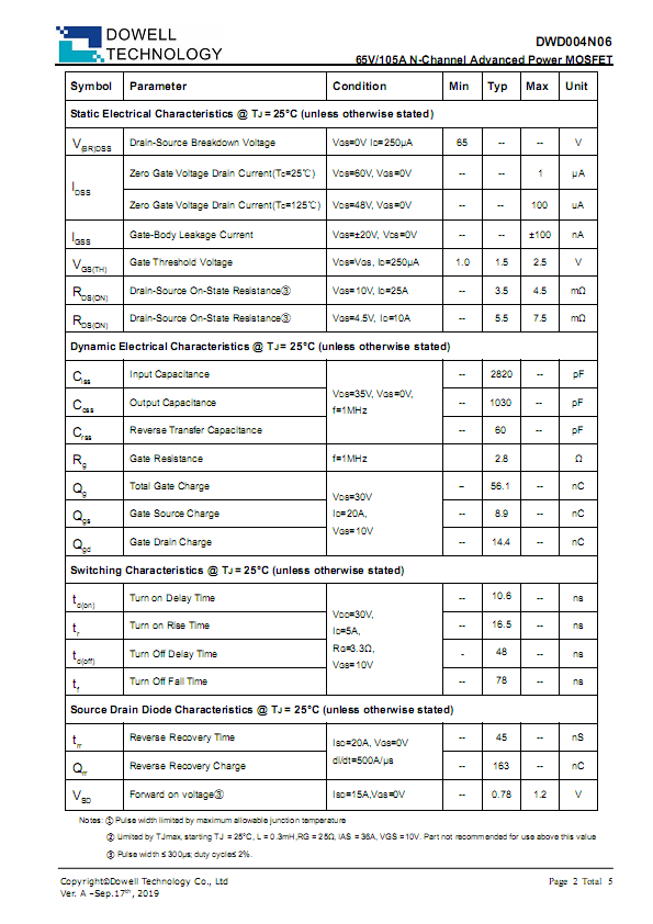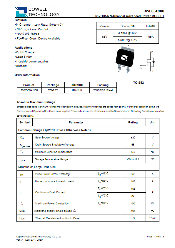 DWD004N06,兼容AOD2606/IRFR7540/IPD053N06N/NCEP60T12AK,65V耐压,电流105A,超低内阻,3.5m? @ 10V ,5.5m? @ 4.5V 。