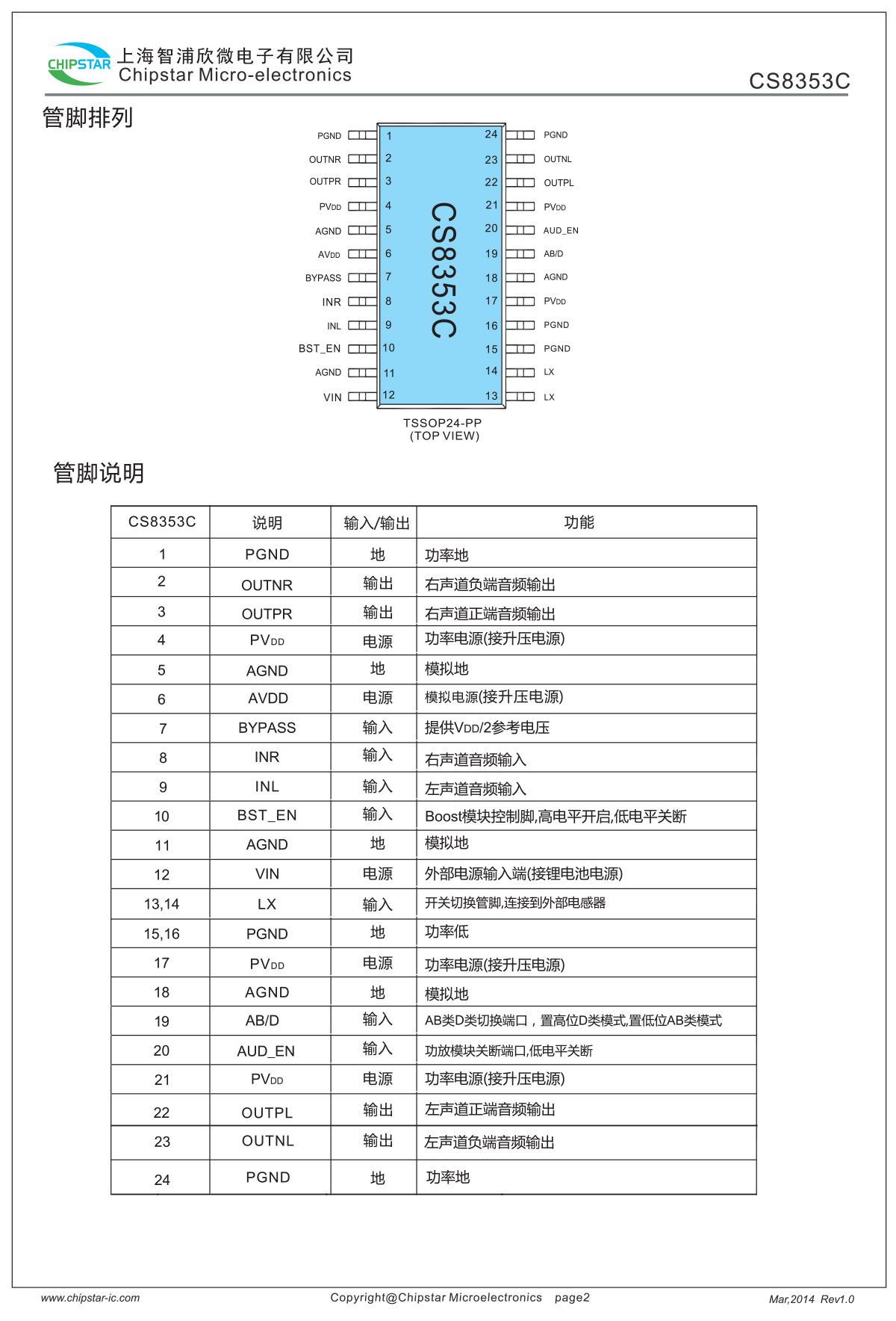 CS8353C提供了纤小的TSSOP24L-PP封装形式供客户选择,其额定的工作温度范围为-40℃至85℃。
