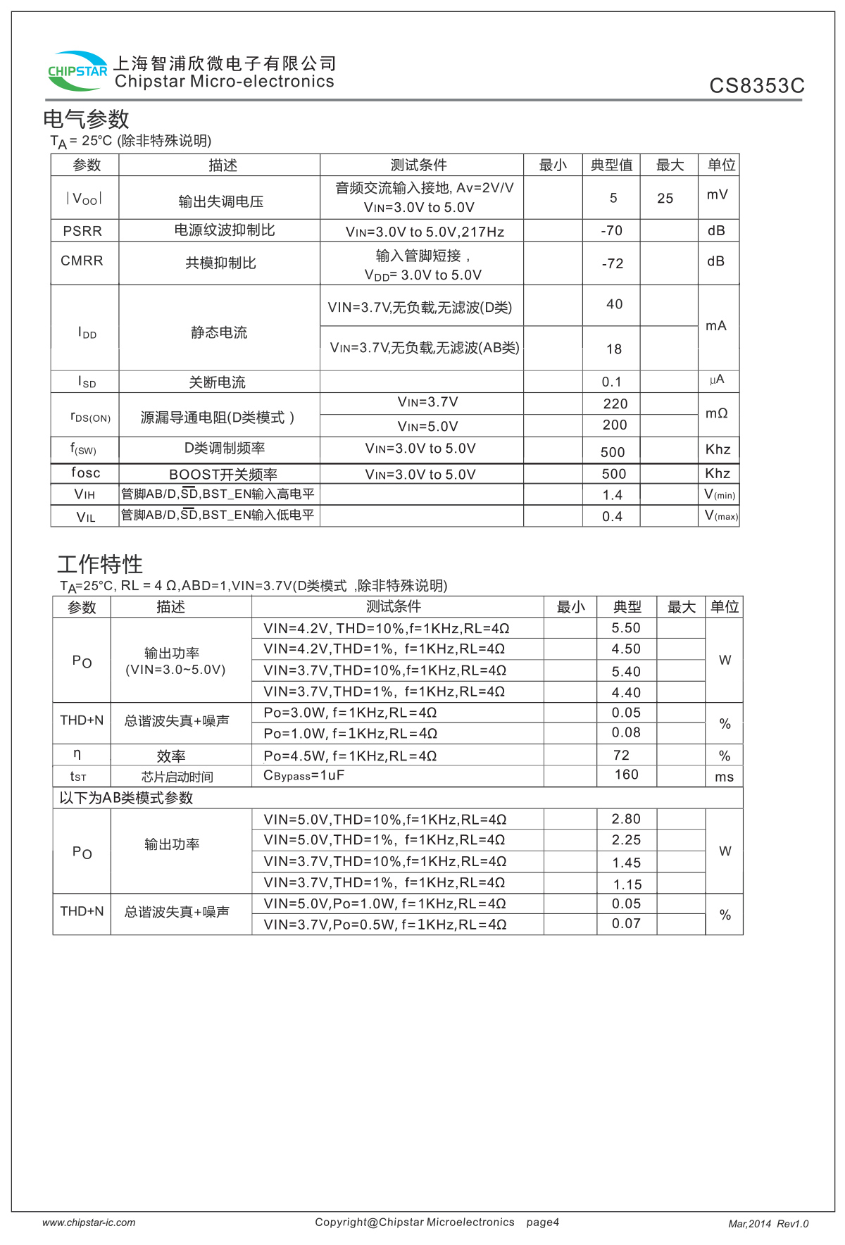 RL = 4Ω 4.50W/CH