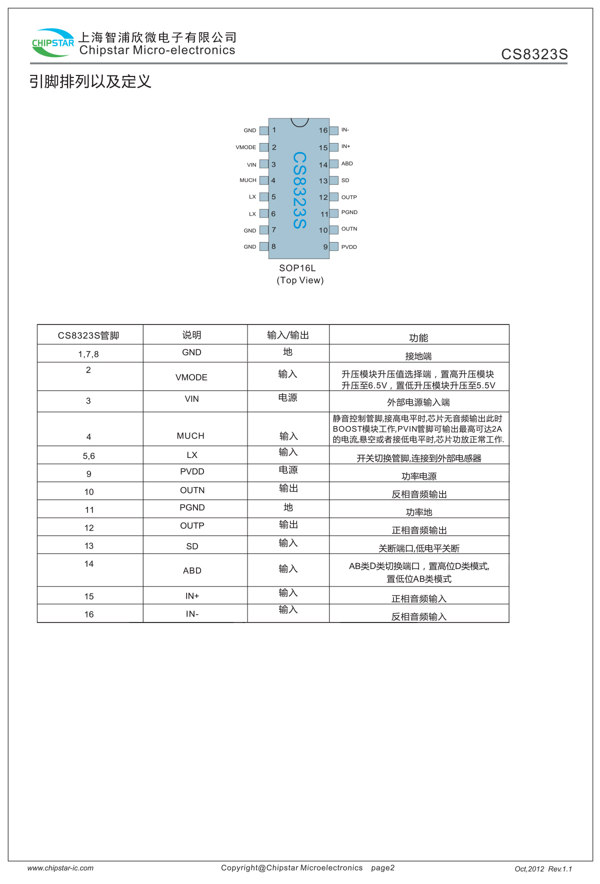 CS8323S是一款内置BOOST升压模块R类音频功率放大器。内置的BOOST升压模块在5.5V和6.5V两个电压点之间可选。当BOOST升压模块在5.5V的情况下,可以为4 Ω的负载提供3.7W的恒定功率,并通过MUCH使能端的控制,BOOST模块可以单独提供最高可达2A的电流输出;当BOOST升压模块在6.5V的情况下,可以为4 Ω的负载提供5.0W的恒定功率.AB类D类可切换模式的设计,最大限度的减少音频子系统中功放对FM的干扰.CS8323S在锂电池的供电电压范围内提供了极致的功率输出,使得CS8323S成为便携式音箱设备特别是扩音器产品的最优选择. CS8323S的全差分架构和极高的PSRR有效地提高了CS8323S对RF噪声的抑制能力。无需滤波器的PWM调制结构及内置的BOOST升压模块,尽可能的减少了外围器件,另外CS8323S内置了过流保护,短路保护和过热保护,有效的保护芯片在异常的工作条件下不被损坏。