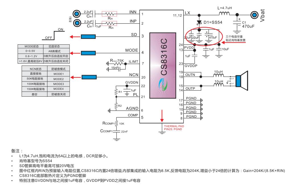 CS8316C:双节锂电池串联供电,固定24倍增益,带防破音功能,AB/D类可切换,带功率限制,内置升压模块,具备自适应升压功能,恒定25W单声道R类自带升压功放。
