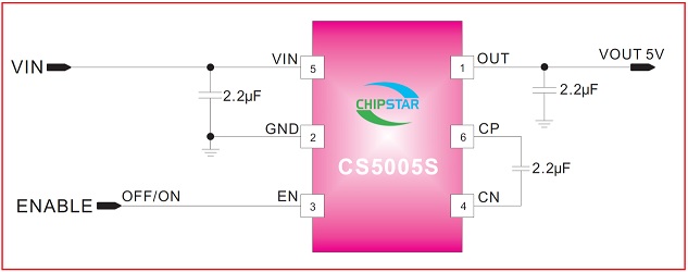 CS5005S是一个具备低噪声、恒定开关频率(300KHz)的电容式电压倍增器。输入2.5至4.5V,产生恒定的5V输出电压,最大输出电流能达到300mA。较少的外部器件(仅有一只自举电容和VIN以及VOUT上的2只旁路电容)使得CS5005S很适合应用于电池供电的小型设备。