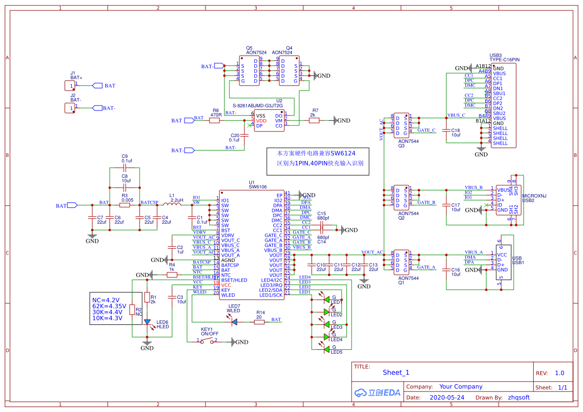 本方案PCB部分兼容SW6124.可直接更换主控芯片。(区别就是SW6106集成了TYPEB的硬件识别。而SW6124没有该功能)