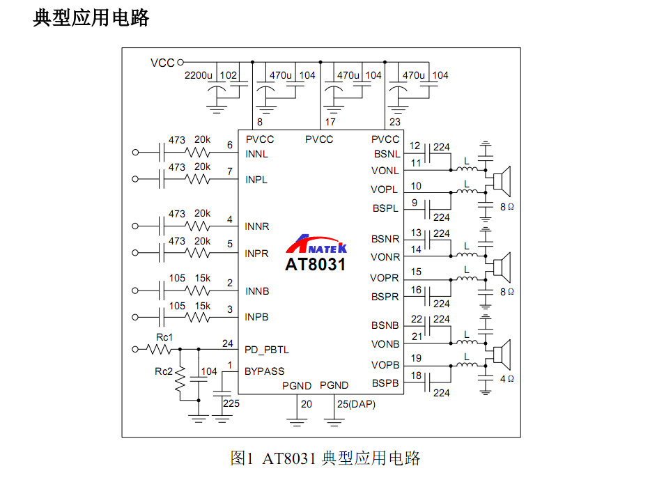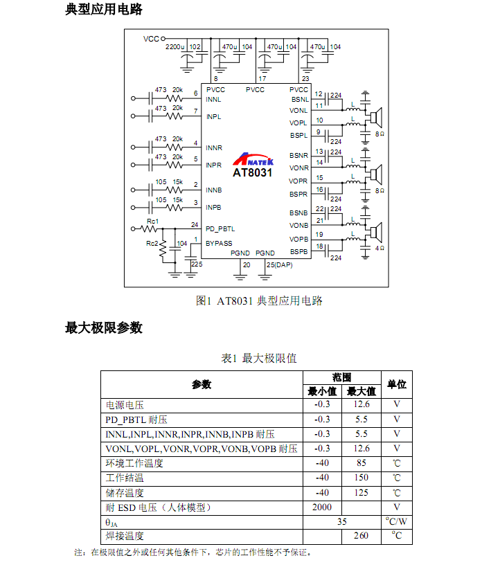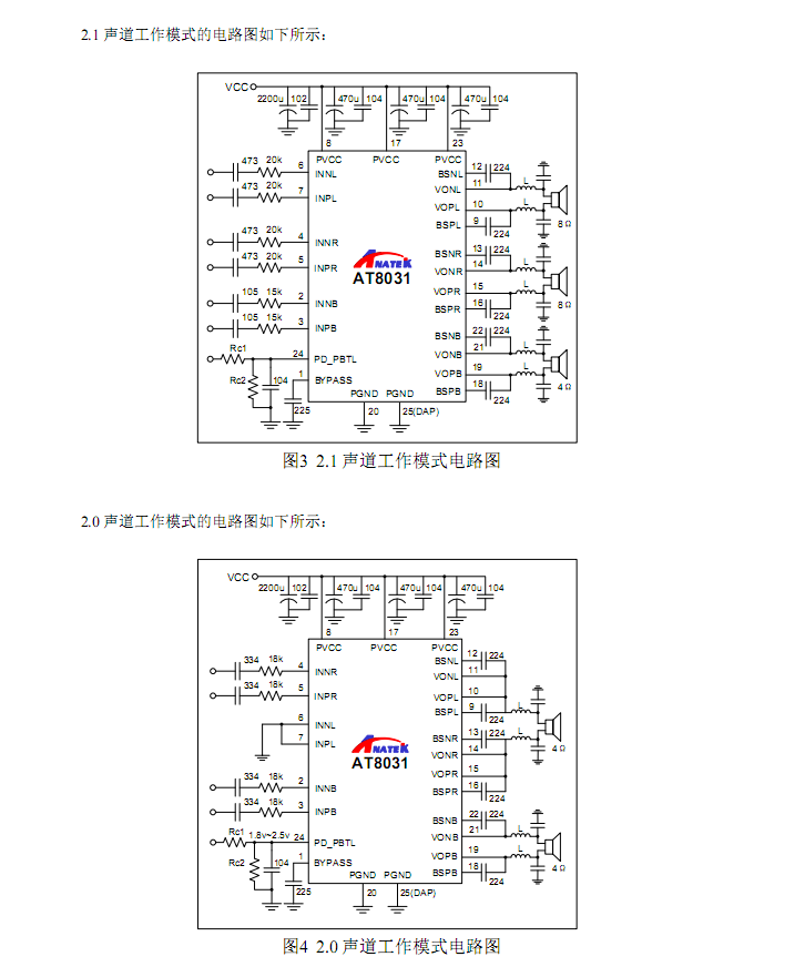 AT8031 是一款单芯片 2.1 声道 class D功放,内置三个通道的 class D 功放,具有 90%以上的效率,无需使用外置散热片,外围电路极其简洁。AT8031 可以支持 5V~12.6V 的电源电压工作范围,每个通道采用 BTL 的输出模式,在左右声道 8欧姆负载,低音声道 4 欧姆负载的条件下,最大可提供 2X8W+16W 的输出功率,PBTL 设计可以将左右两个小功率声道并联成一个声道,与低音通道一起组合成一个 2X16W的立体声功放。