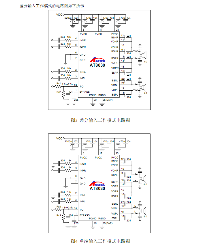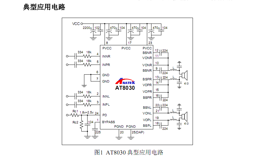 AT8030 是一款单芯片 2.0 声道 class D 音频功放,具有 90%以上的效率,无需使用外置散热片,外围电路简洁。AT8030可以支持 5V~12.6V 的电源电压工作范围,每个通道采用 BTL的输出模式,在左右声道 4 欧姆负载的条件下,最大可提供2X15W 的输出功率,AT8030 具有独特的防破音设计,在输入音频信号过载的情况下,功放自动调整增益,确保输出不会失真。