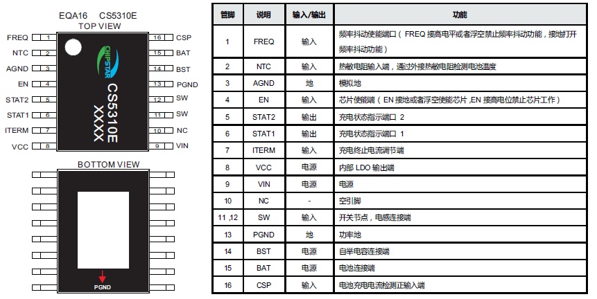 CS5310E具有完善的保护功能,包括输入欠压和过压保护、电池过压和短路保护、电池温度保护、芯片温度调节和保护,同时还具备电池反接保护功能。此外芯片通过外 接的两路LED指示灯,可对充电过程实现全程监控。